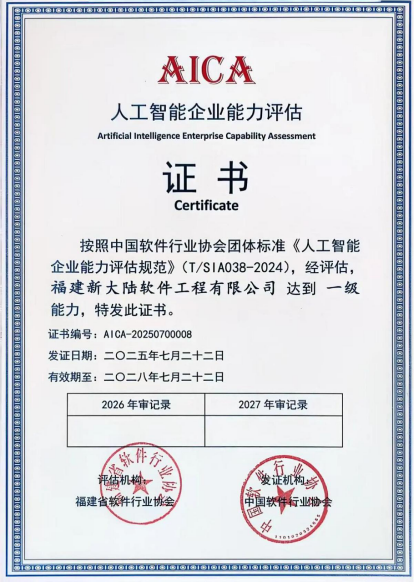 近日,新大陆软件公司成功通过中国软件行业协会 “人工智能企业能力”一级评审,成为福建省首家获此殊荣的企业。这一成绩不仅是对企业自身技术实力与发展水平的肯定,也为福建省人工智能企业树立了合规发展、提升能力的标杆,将助力区域数字产业集群的构建与发展。