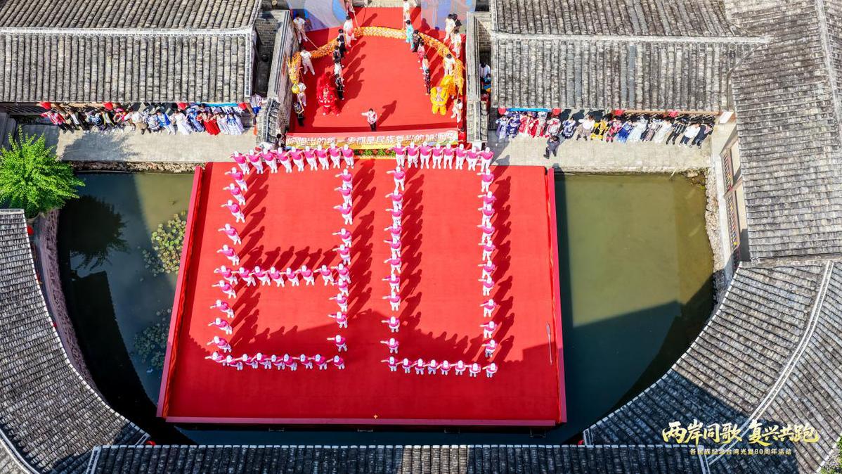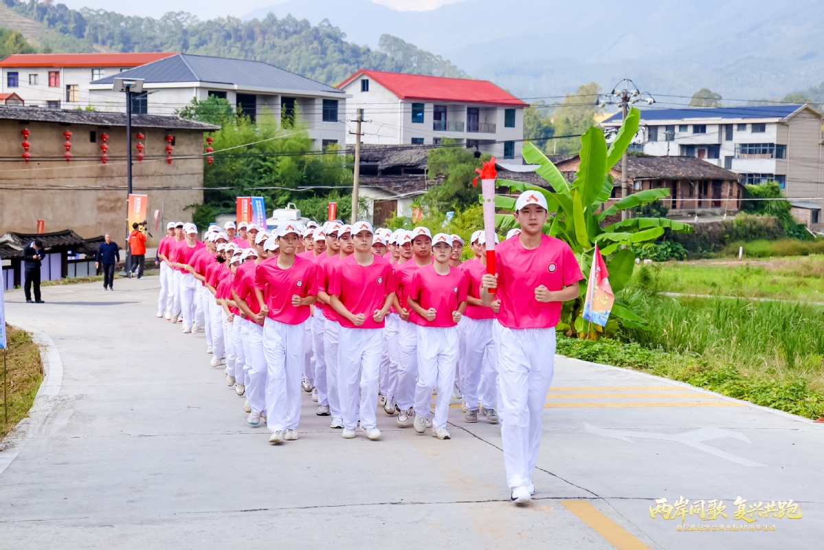 火炬经接力传递,80名两岸各民族代表自复兴堡起跑,一路感受永安这座城市的红色文化与历史印迹。为铭记这一时刻,“跑友”排列成“80”造型,齐声高唱《龙的传人》,将现场气氛推向高潮。