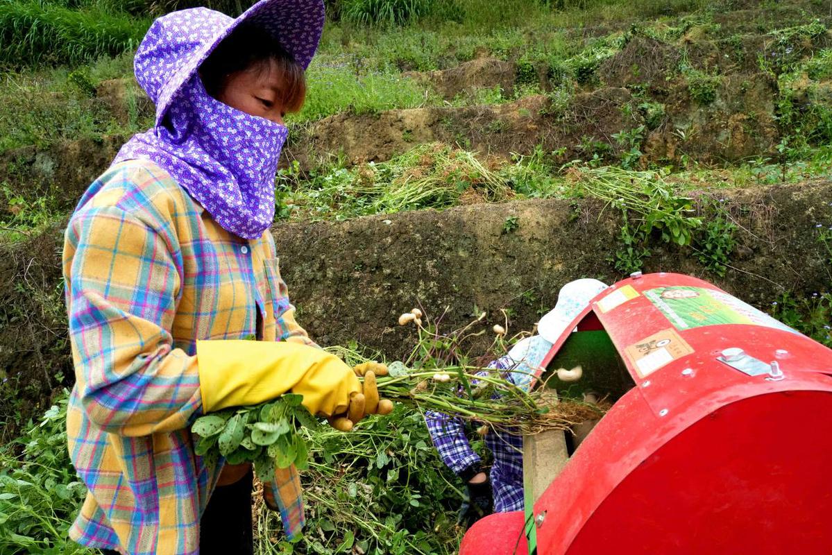 村民们将收割好的花生在小型花生脱粒机上进行花生脱粒作业。(供图)