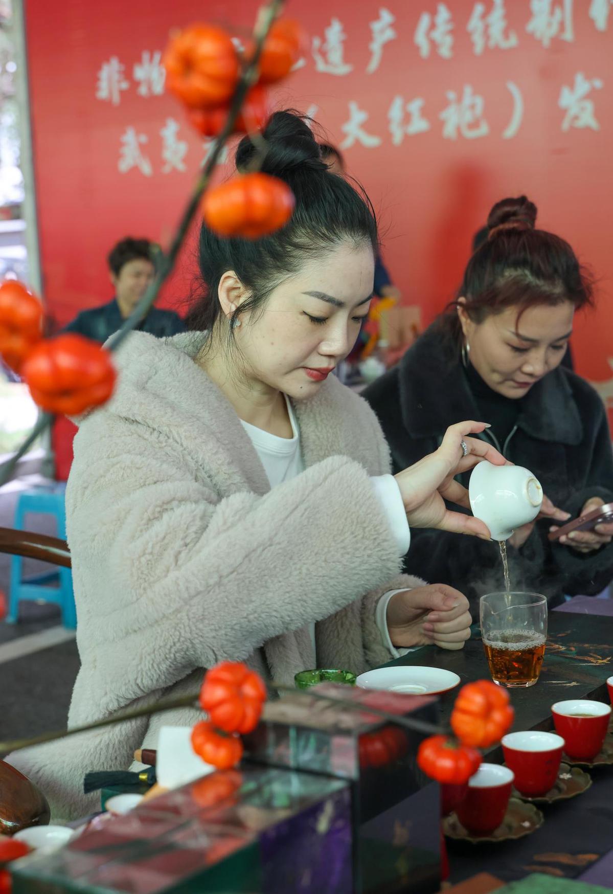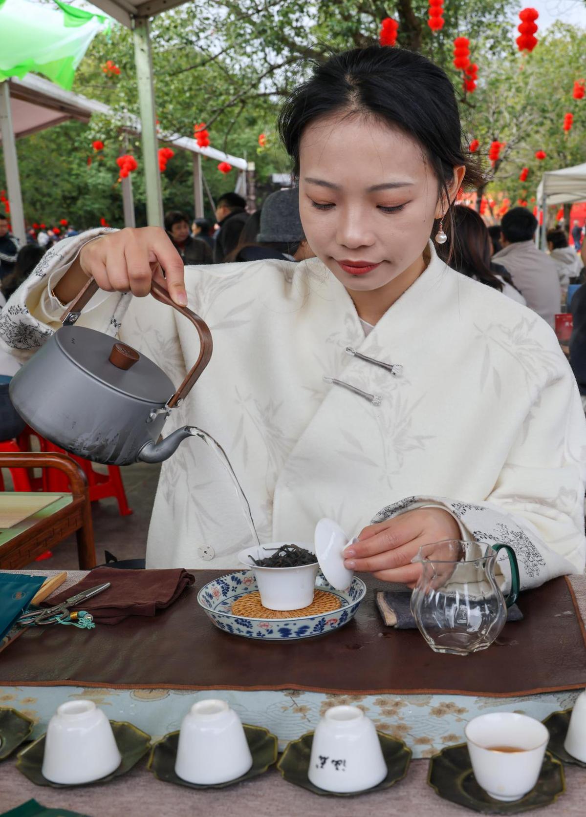 11月18日,武夷山市天心村茶艺师在武夷山市天心村斗茶节百家茶席上表演茶艺。(邱汝泉 摄)