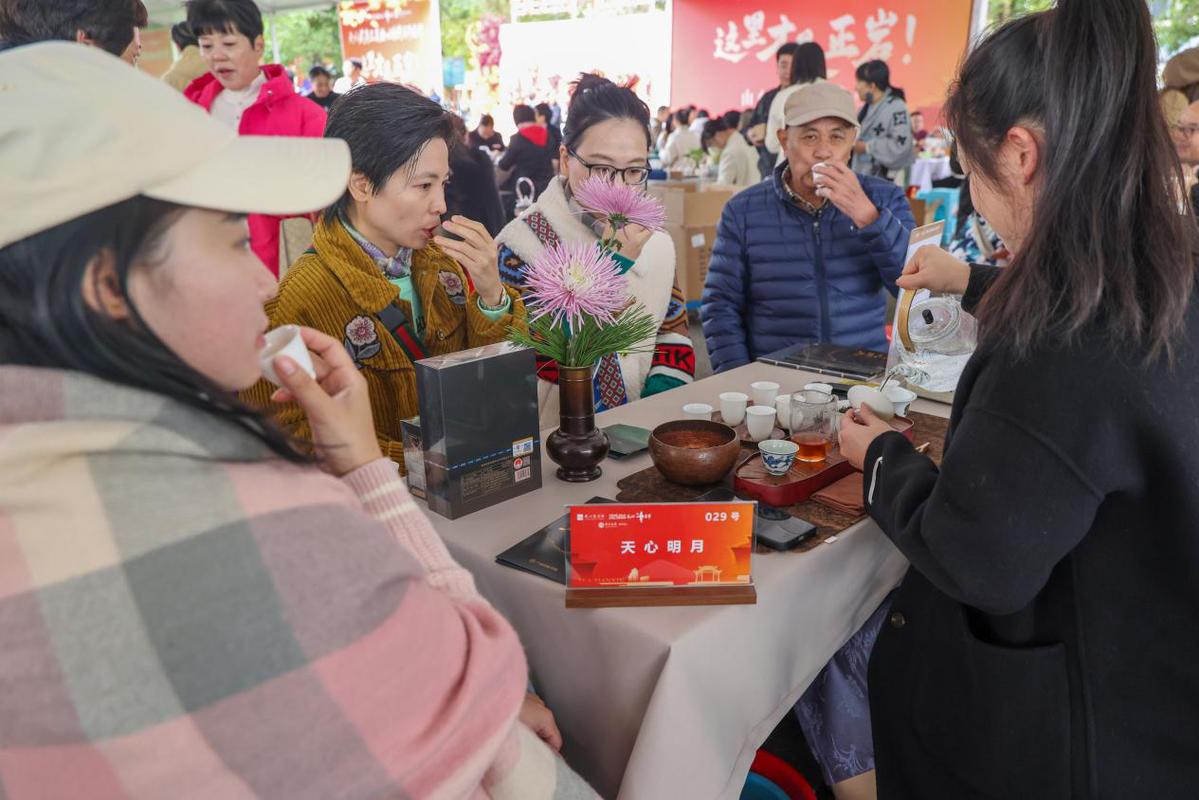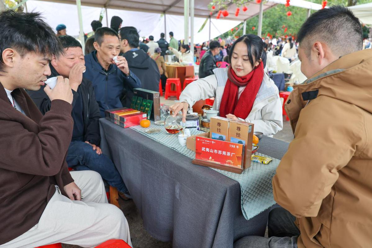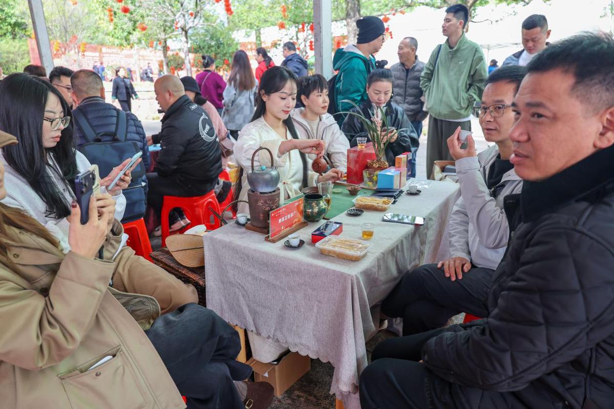 11月18日,茶人在武夷山市天心村百家茶席上赏茶艺、品武夷山岩茶。(邱汝泉 摄)