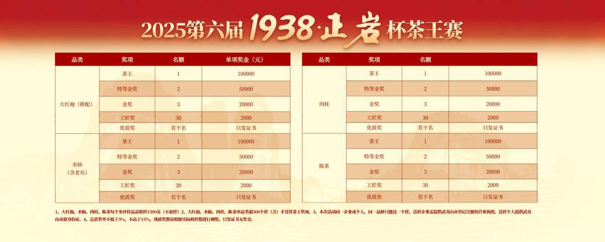 本届赛事在奖项设置和奖金规模上均创下历届之最。赛事设置大红袍、水仙、肉桂、陈茶四大品类,设立茶王、特等金奖、金奖、工匠奖等多个奖项。其中,茶王奖金高达10万元,特等金奖奖金5万元,金奖奖金2万元,总奖金规模超过百万元,充分彰显了赛事对卓越品质和匠心精神的推崇。