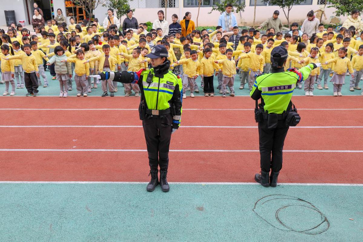 12月2日,武夷山公安局交警大队民警辅警在百花幼儿园与萌娃一起进行手势指挥演练。(邱汝泉 摄)