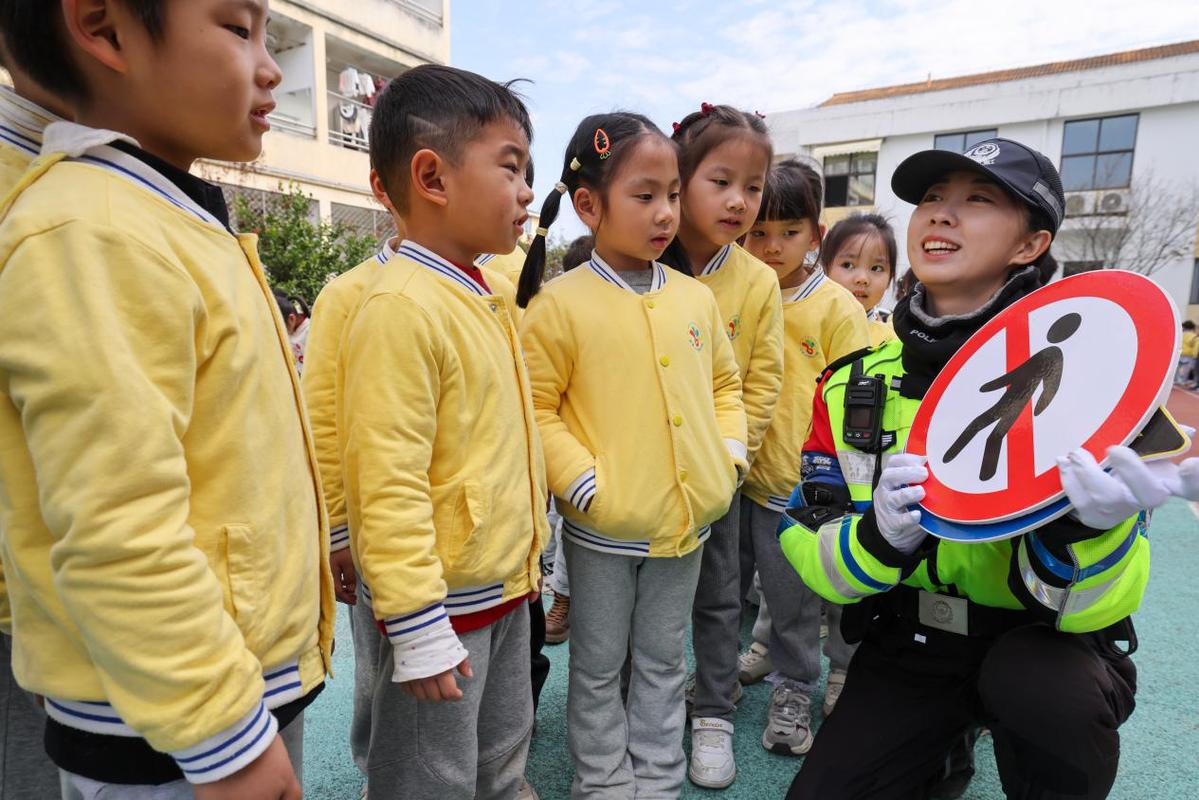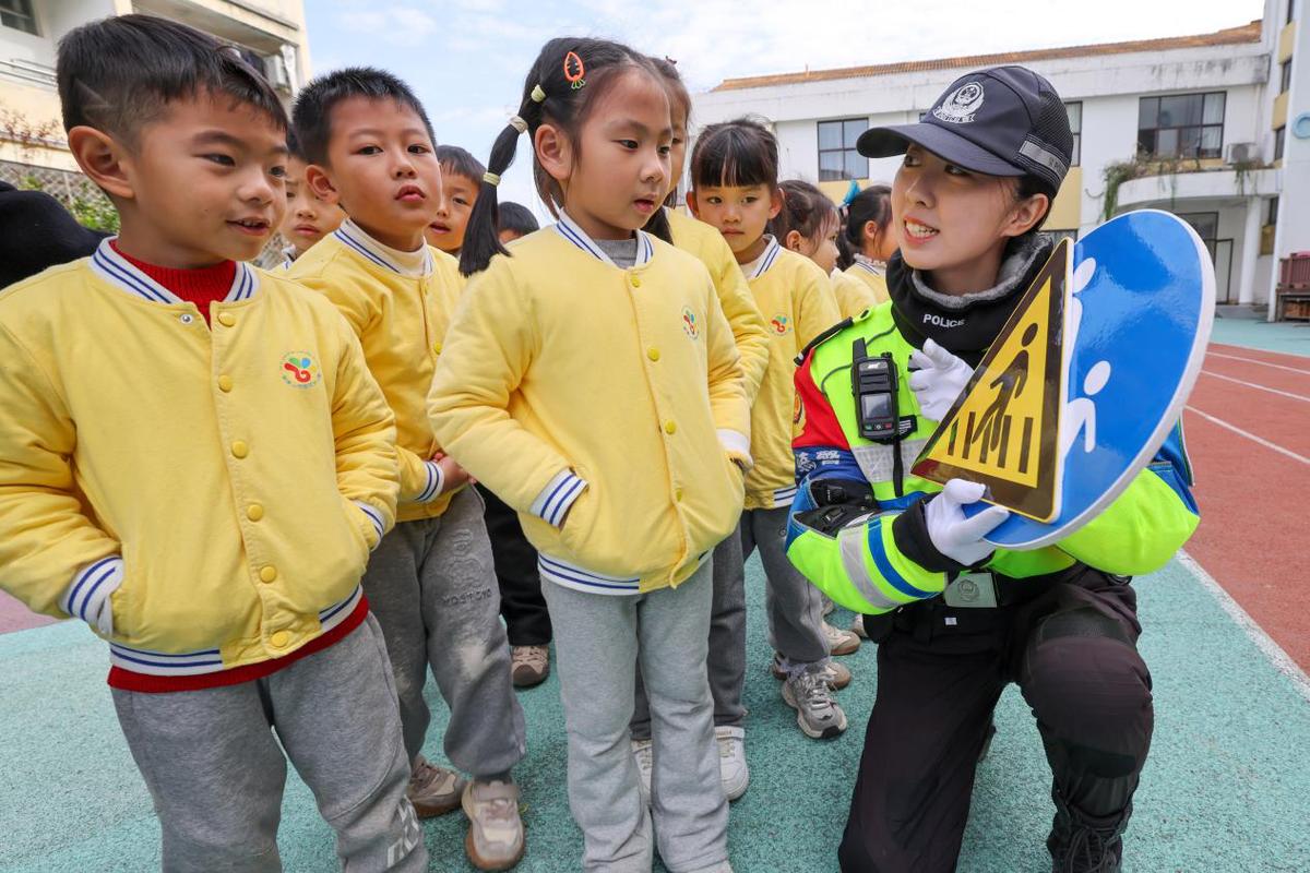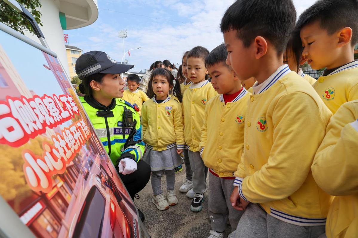 12月2日,武夷山公安局交警大队民警在百花幼儿园教萌娃认识标识标线。(彭剑伟 摄)