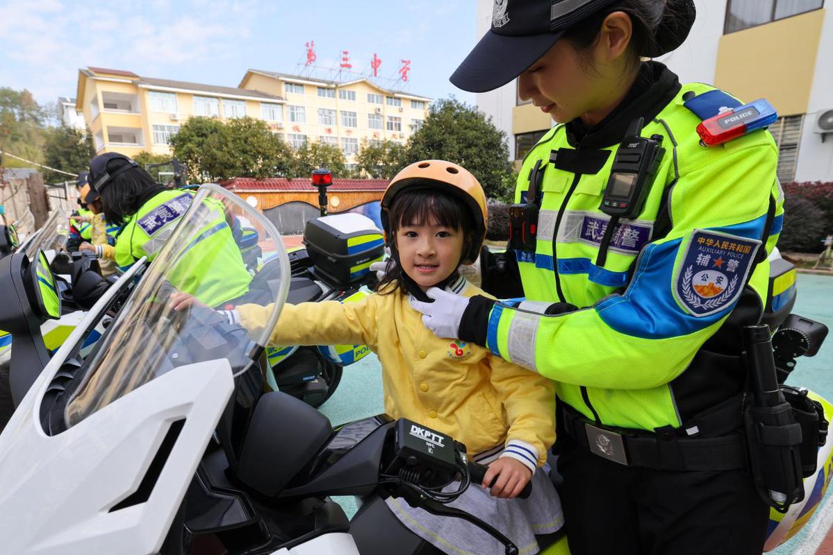 12月2日,武夷山公安局交警大队民警辅警在百花幼儿园给萌娃佩戴安全帽。(彭剑伟 摄)