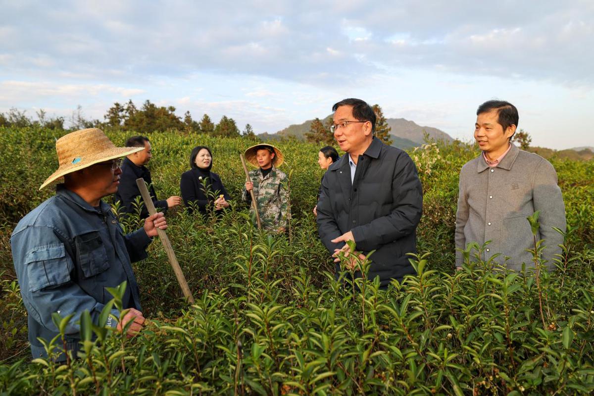 12月2日,人民银行武夷山营业管理部武夷山农商银行工作人员在黄村村武萱茗岩茶厂绿色生态茶园了解茶叶生长情况。(邱汝泉 摄)