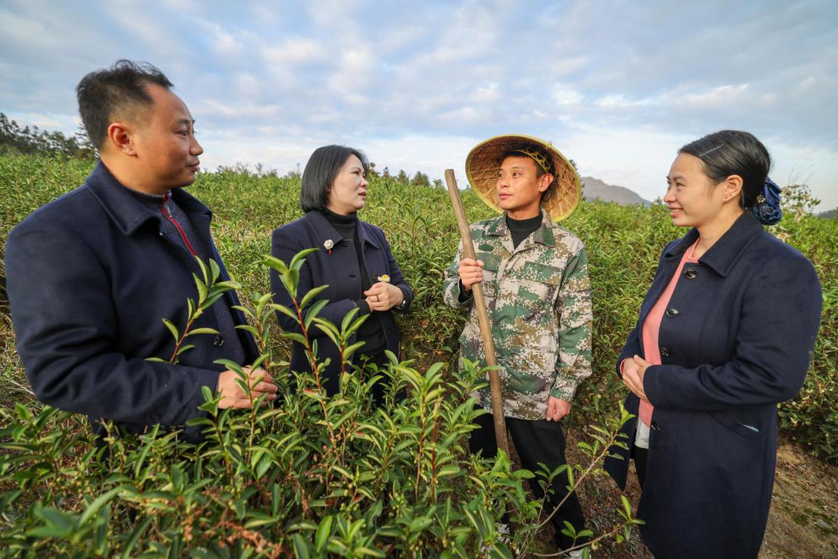 12月2日,武夷山农商银行工作人员在黄村村武萱茗岩茶厂绿色生态茶园了解茶叶生长情况。(邱汝泉 摄)