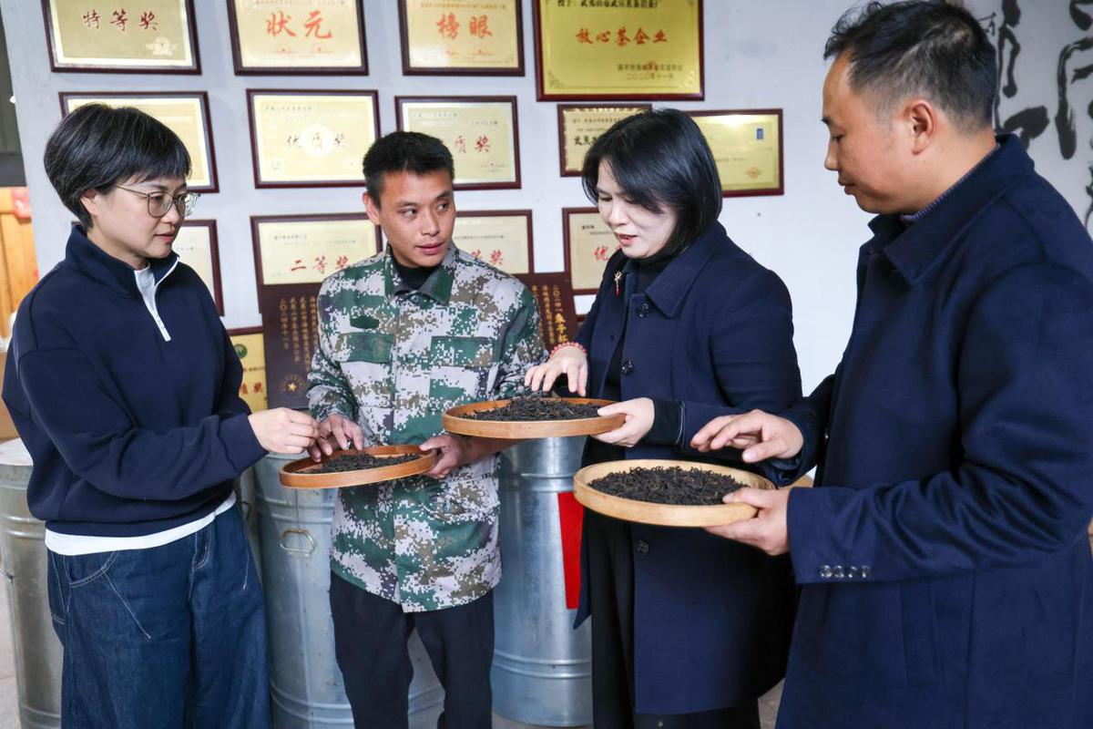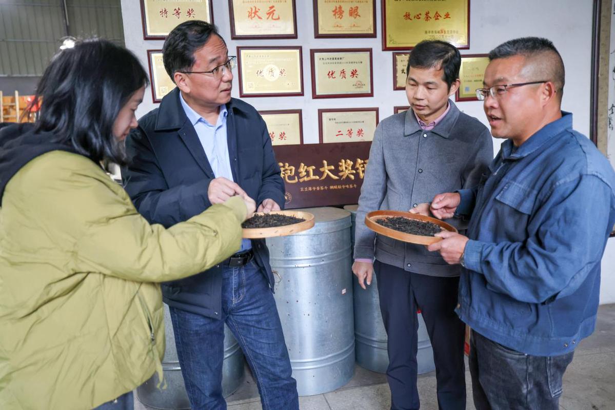 12月2日,人民银行武夷山营业管理部工作人员在黄村村武萱茗岩茶厂了解茶叶生产、加工、销售情况。(邱汝泉 摄)