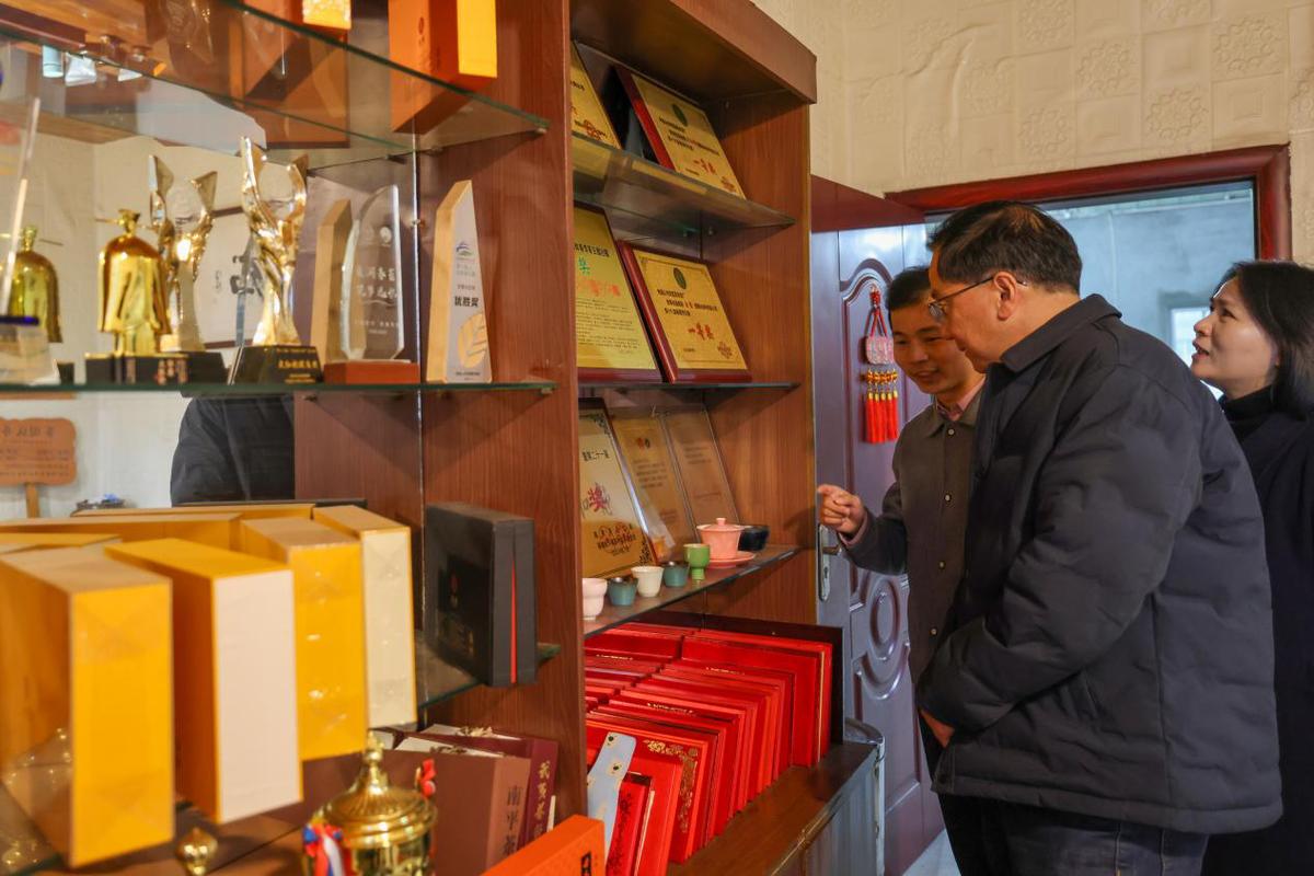 12月2日,人民银行武夷山营业管理部武夷山农商银行工作人员在黄村村武萱茗岩茶厂察看茶厂发展历程。(张旭文 摄)