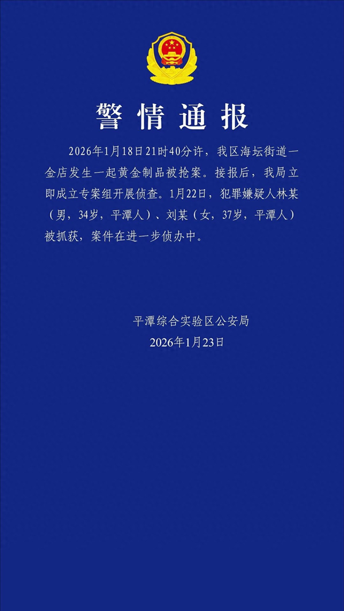 平潭综合实验区公安局1月23日发布警情通报:2026年1月18日21时40分许,我区海坛街道一金店发生一起黄金制品被抢案。接报后,我局立即成立专案组开展侦查。1月22日,犯罪嫌疑人林某(男,34岁,平潭人)、刘某(女,37岁,平潭人)被抓获,案件在进一步侦办中。