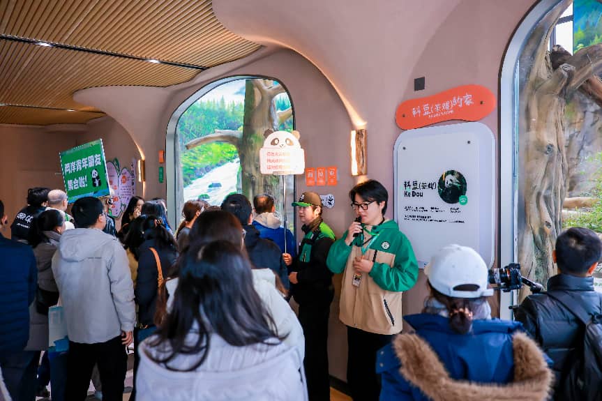 走进1号馆,大熊猫“艾伦”正悠闲地啃着翠绿的竹叶,憨态可掬的模样引得青年们纷纷举起手机记录美好瞬间;隔壁场馆的“荣耀”则趴在木架旁闭目养神,偶尔舒展身姿的慵懒动作,引来现场阵阵惊喜的低语。随着参观路线延伸,活泼的双胞胎大熊猫“启程”和“启航”在园区内追逐嬉戏,圆滚滚的身躯、灵动的动作让现场洋溢着欢快的笑声;不远处,帅气的“晶亮”专注啃咬竹枝的姿态,也让大家驻足欣赏、不忍打扰。