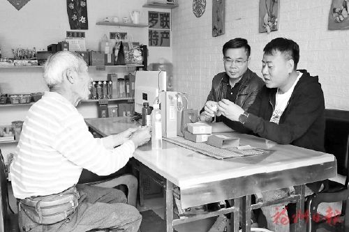 返乡人才陈炎弟(中)琢磨如何打造罗联特产名片。(吕灿婷 摄)