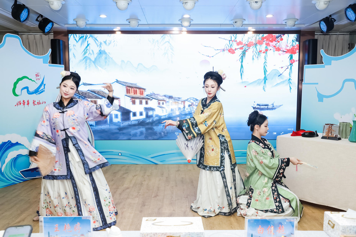 随着悠扬的古筝曲在江畔流淌,游轮鸣笛启航,活动正式拉开序幕。落日余晖,游船之上,非物质文化遗产代表性传承人轮番登场,娓娓道来福州千年时光中的文化秘密。福州非遗体验项目“三条簪”的表演者,以灵动舞姿精准诠释非遗文化韵味,推动古老艺术在舞台上绽放别样光彩。舞毕,学子们报以热烈的掌声,眼中闪烁着对这份鲜活非遗的惊叹与喜爱。来自福建农林大学的汪鹏翼深受触动:“太美了!这让我想起了家乡的黄梅戏,同样是源于生活、充满泥土芬芳的艺术。”在大家期待的目光中,他即兴清唱了一段《同窗》选段,婉转的唱腔引得满堂喝彩。这份跨越地域的传统文化共鸣,让现场氛围更加热烈。尚干拌面扁肉古法制作技艺传承人林俊杰现场展示了特色制作绝活,他手法娴熟,揉面、擀皮、包馅、烹煮一气呵成,现场顿时弥漫开浓郁的骨汤香气和猪油葱香。当一碗碗热气腾腾、晶莹剔透的扁肉拌面送到学子们手中时,大家迫不及待地品尝起来,赞叹声此起彼伏,不少学子边吃边围在林师傅身边,好奇地询问着选材和制作的秘诀,眼神里充满了对这份“舌尖上的非遗”的满足与探索欲。