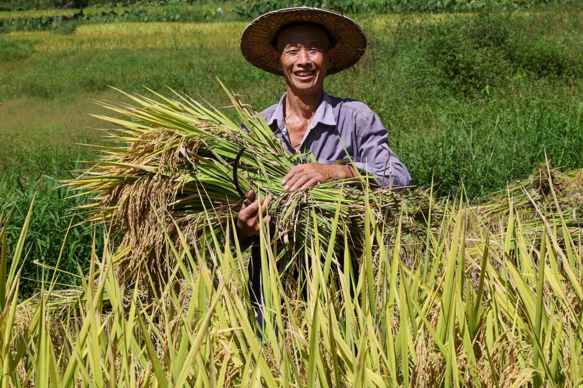 9月17日,武夷山市岚谷乡客溪村村民余景明水稻丰收喜上眉梢。(邱汝泉 摄)
