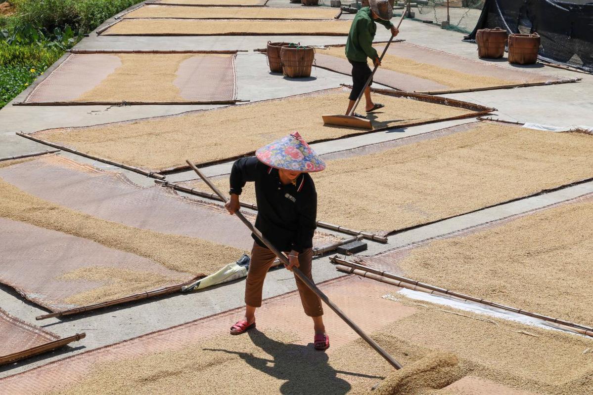 9月17日,武夷山市岚谷乡客溪村村民陈珍娇、徐培环在谷蓆上晾晒稻谷。(邱汝泉 摄)