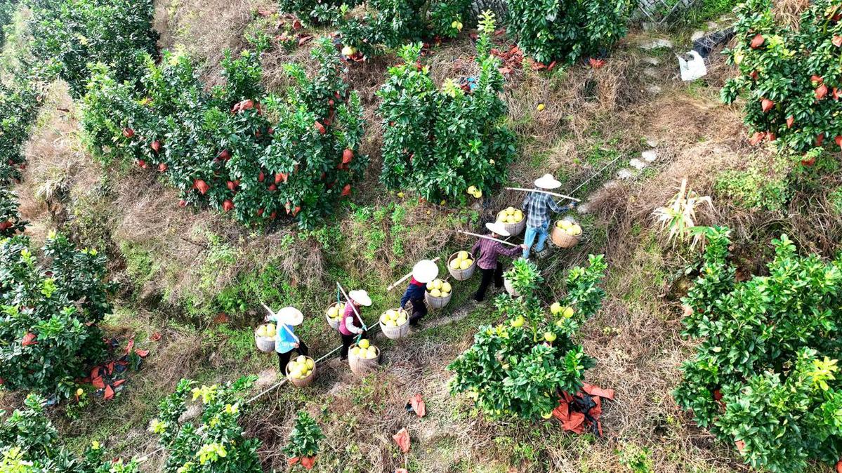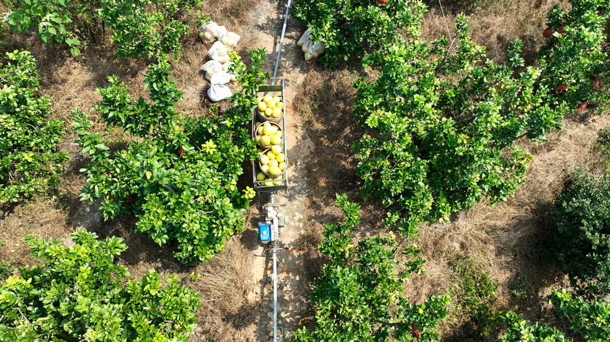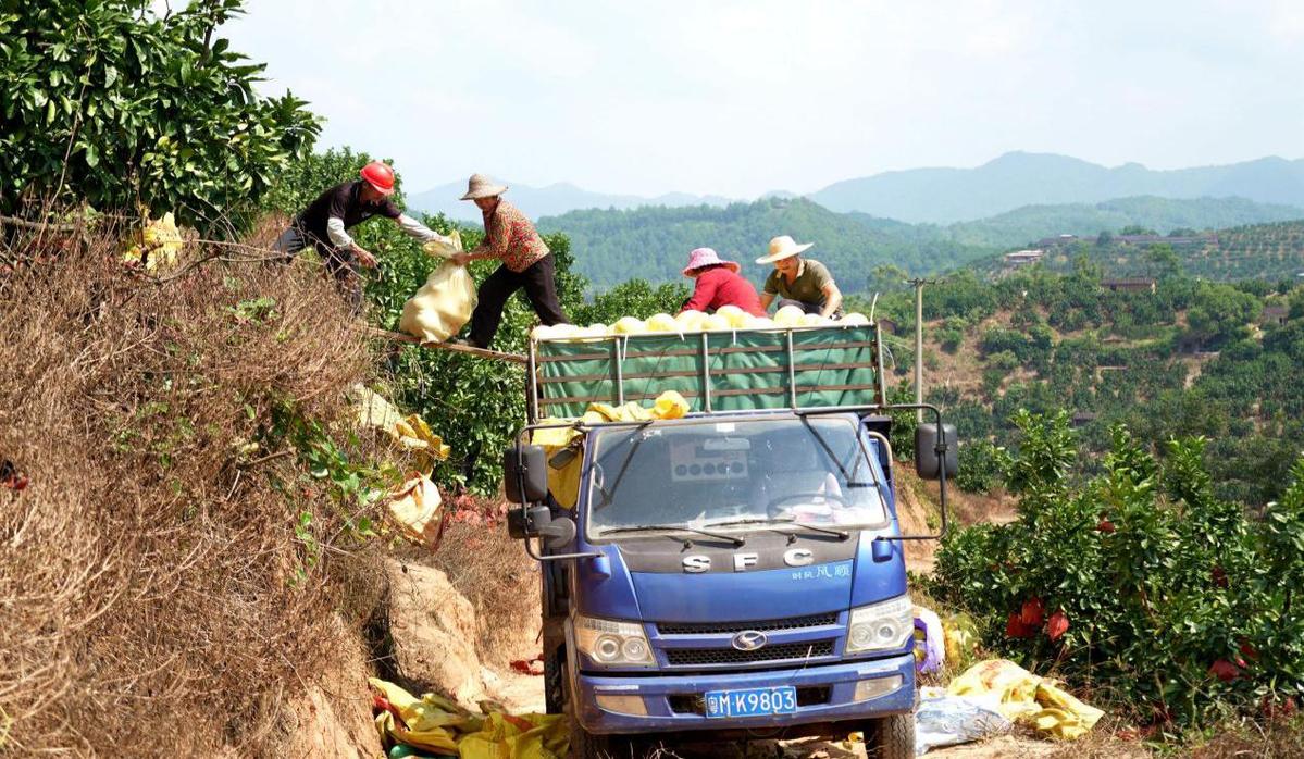 9月18日,永定区洪山镇田梓村数千亩的蜜柚种植基地里,山坡与平地上的果树整齐排列,一颗颗圆鼓鼓、沉甸甸的蜜柚挂满枝头,柚农们三五成群忙着采摘,脸上满是丰收的喜悦。山坡蜿蜒的单轨上,满载蜜柚的运输车匀速穿梭,以往人工背运200斤蜜柚需半小时的路程,如今“小火车”5分钟就能完成,既减轻了劳作强度,又缩短了采收周期。得益于当地的生态种植模式,这里的蜜柚果大、味甜、水分充足,一上市即吸引各地收购商抢购。