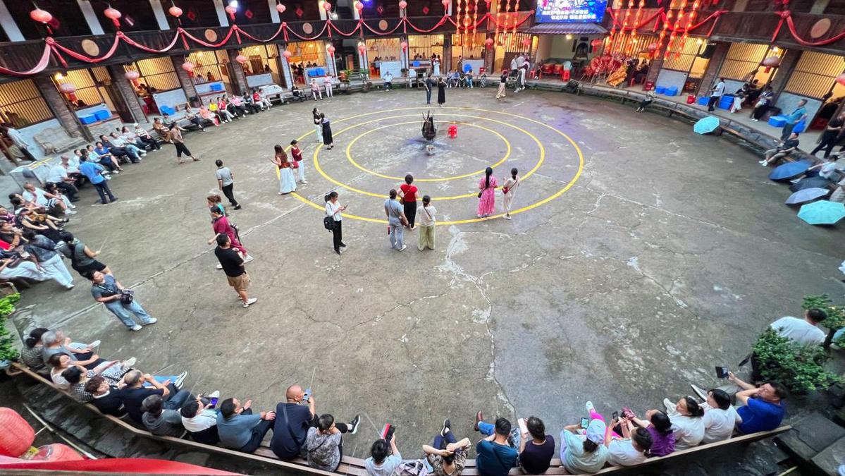 远处,万石村永源楼内传来“咚、咚、咚”三声鼓响——那是大溪大鼓的独特节奏,声音能传三里远,正是客家人“唤醒睡狮”的千年传承。李前鑫是永源楼的“老板”,几年前,看到了土楼旅游带来的辐射效应,他承包下了这座落空的土楼,开起农家乐,办起篝火晚会。白天,游客跟着学晒柿饼、打糍粑,看阳光在柿子上跳跃;夜晚,篝火燃起,《七月火把节》的旋律里,村民与游客手拉手踏歌,欣赏铿锵有力的大鼓表演,时紧时慢的节奏像极了战鼓催春,火光映着土楼斑驳的墙,像极了客家人五百年传承的“鼓”之坚韧、“柿”之甜蜜、“虹”之希望。这一方天地,更让25位村民有了常年营生。
