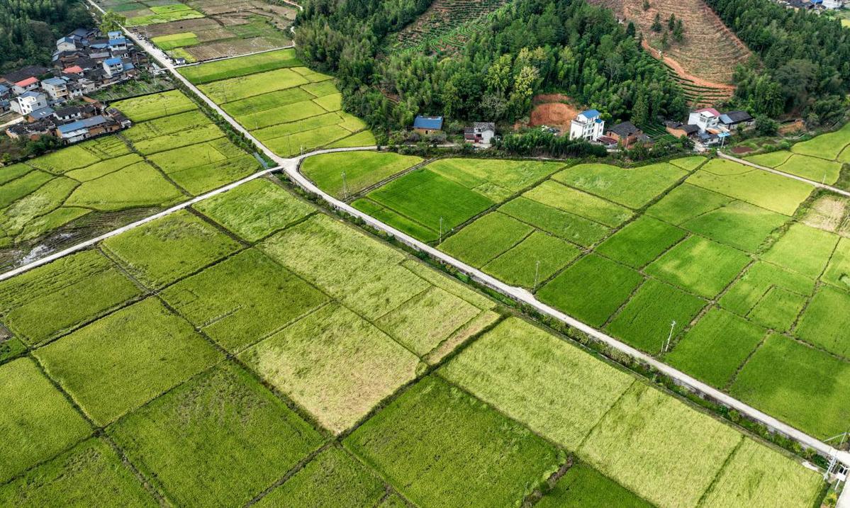 10月17日,武夷山市岚谷乡横墩、岚谷村千亩高标准农田丰收景象(无人机照片)。
