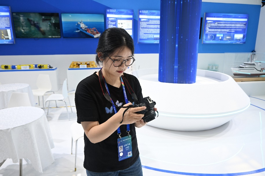 为了提升志愿者专业与大会需求的契合度,本届大会志愿者侧重招募海洋经济类、装备制造类专业学生。来自福建农林大学渔业发展专业的张洁,终于与心心念念的“闽投1号”来了一次“亲密接触”。得知全国首台半潜式渔旅融合深远海养殖装备“闽投1号”在四号馆展出,作为“小茉莉”的她,倍感振奋和自豪:“亲眼见证渔业养殖技术的蓬勃发展,中国现代渔业翻开崭新篇章,更激励我在未来的学习中加倍努力。”