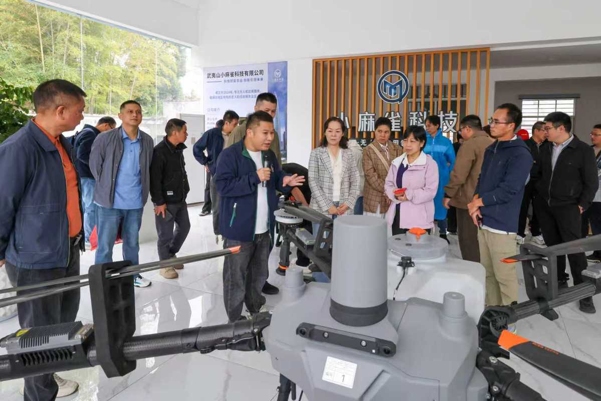 10月21日,与会嘉宾在武夷山市小麻雀科技有限公司参观农业无人机。(邱汝泉 摄)