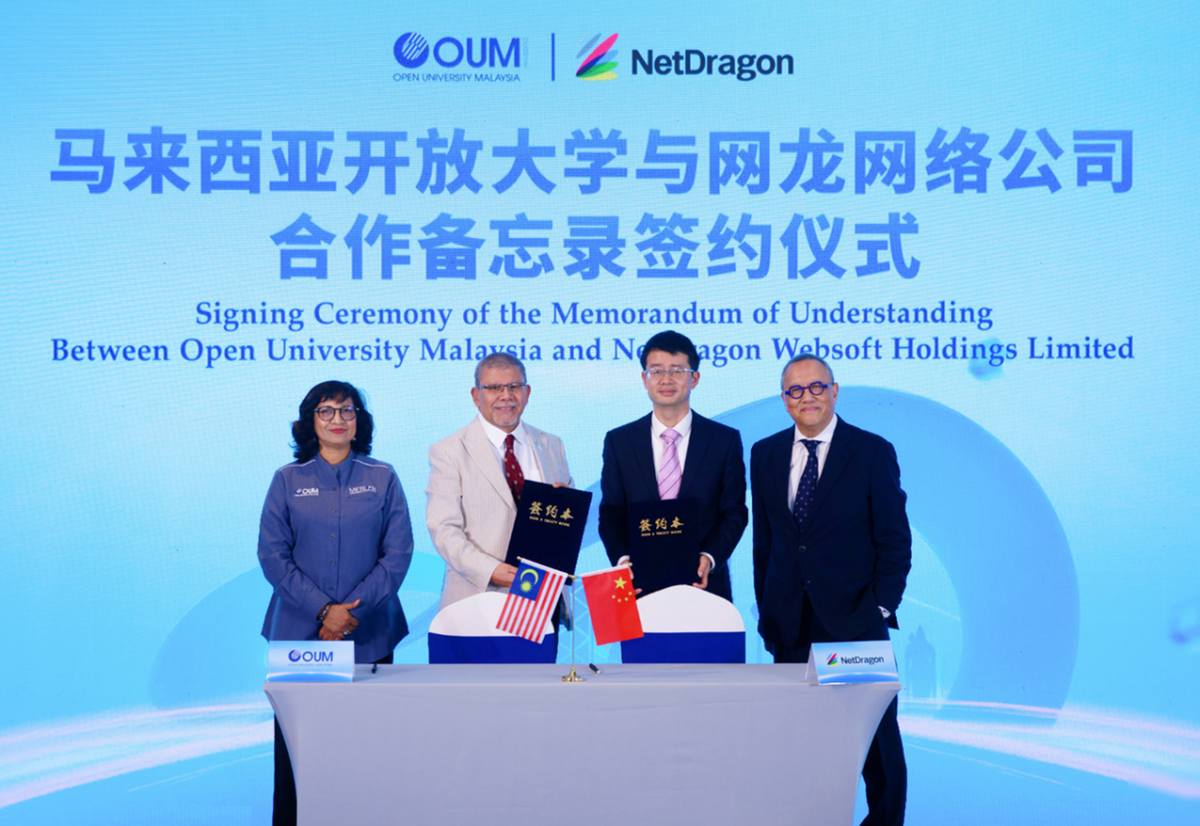 10月23日,网龙网络控股有限公司(以下简称“网龙”)与马来西亚开放大学(以下简称“OUM”)在福州长乐隆重签署战略合作谅解备忘录。此次合作标志着双方将整合各自在开放教育与数字技术领域的优势,共同探索人工智能等前沿科技在教育领域的深度融合与应用,为全球开放与远程教育的发展树立新标杆。