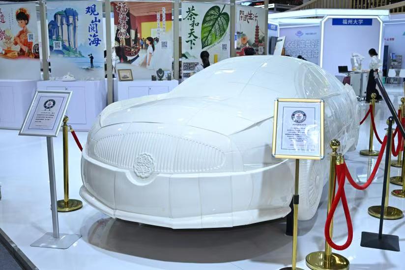 值得一提的是,福建馆首次集中展出两件“镇馆之宝”:一件是来自德化陆升集团的1:1白瓷汽车雕塑,创下“最大的汽车造型陶瓷雕塑”吉尼斯世界纪录。这一成果不仅是对德化陶瓷材料和烧制工艺的一次极限挑战和突破,也是对德化陶瓷文化和制作技艺传承及创新的全面展示;另一件是泉州市东星奢石博物馆的“天然夜明珠之王”,重达1吨,价值数亿元,是全球已知最大天然夜明珠之一。同期亮相的《百福》系列羊脂玉瓷茶壶,以百位名人“福”字墨宝为饰,融合手工雕刻与描金工艺,成为“福文化”的典雅载体。