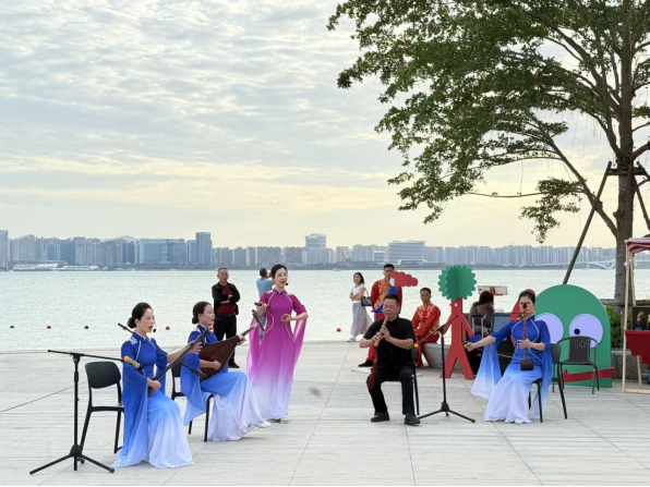 在荻花洲驿站广场,一场非遗与旅游深度融合的盛宴正在上演。翔安区春仔花非遗传承人洪晓瑜指尖翻飞,一朵朵象征吉祥的丝线花悄然绽放。车鼓弄、答嘴鼓等富有闽南特色的非遗项目轮番展演,为这片滨海空间注入了深厚的文化底蕴。