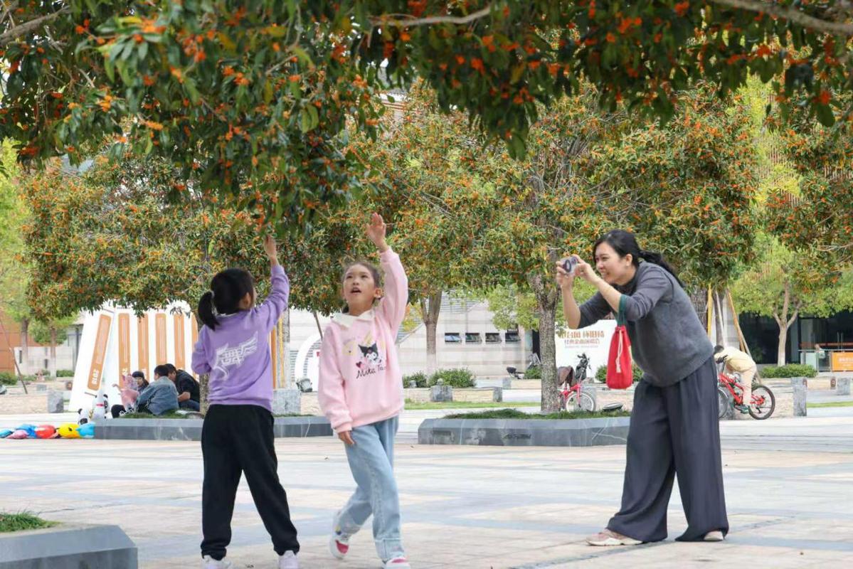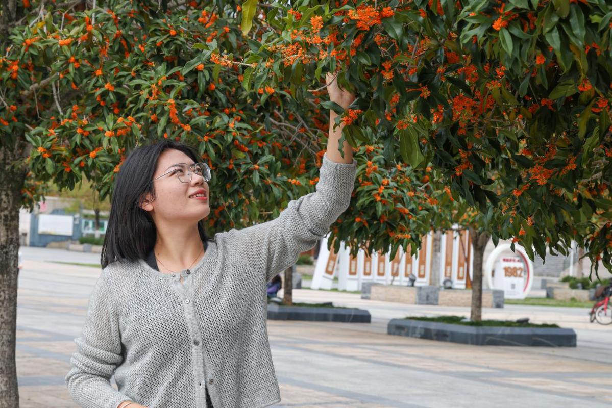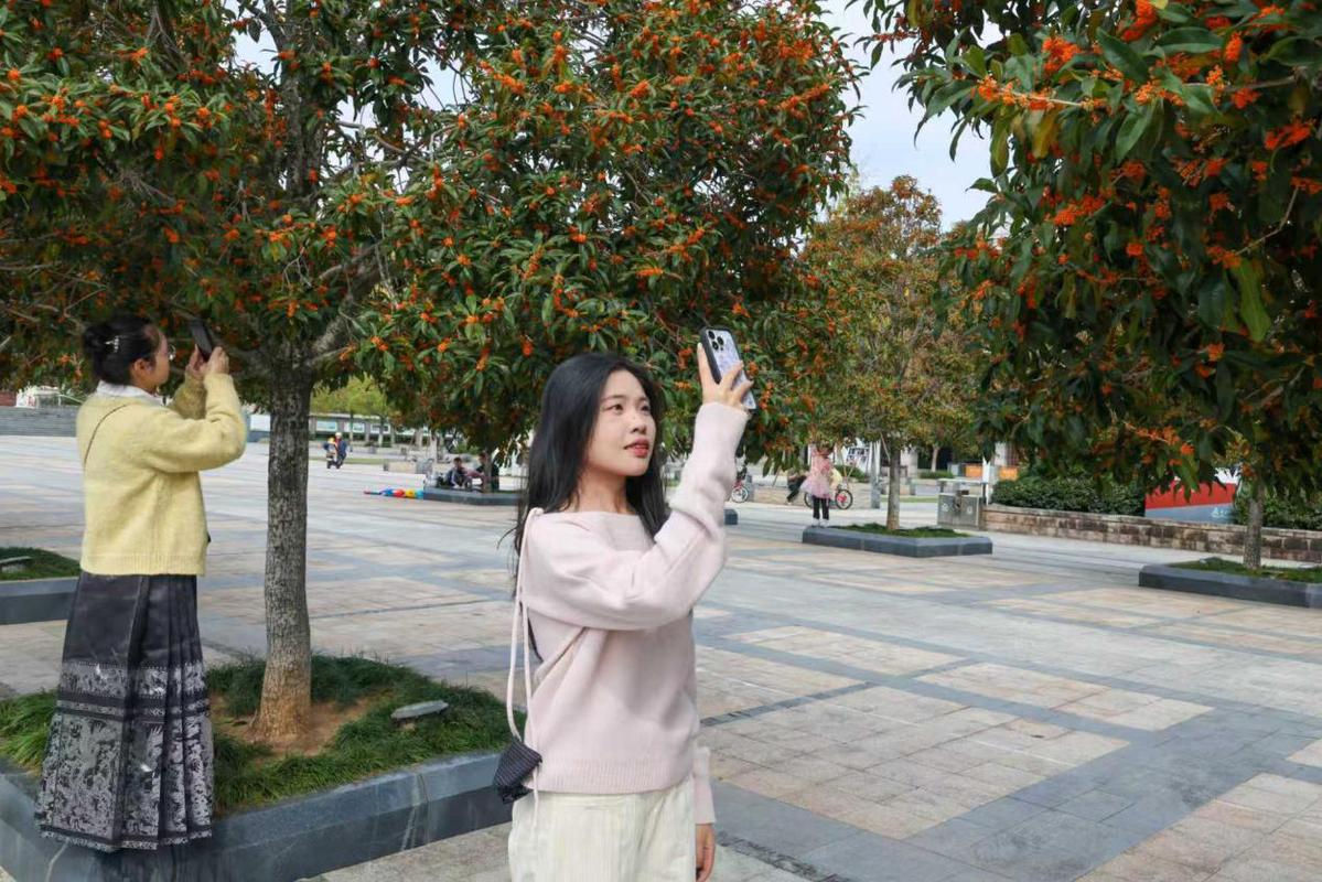 武夷山市民在市民广场观赏盛开的桂花拍照。(邱汝泉 摄)