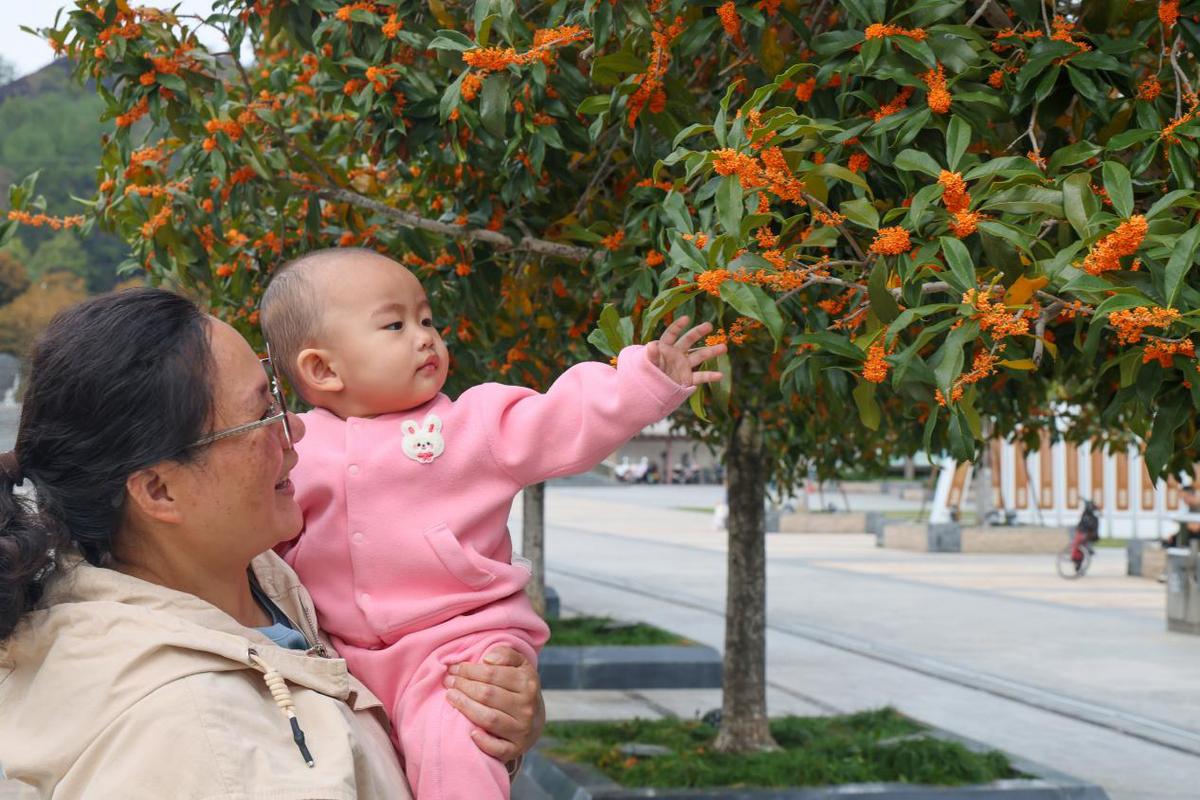 近日,武夷山市区各公园广场的桂花盛开,丹桂飘香,秋高气爽,是人们赏花的好时节,人们走出家门观赏桂花。武夷山市民广场桂花园成为市民、游客新的拍照打卡点。