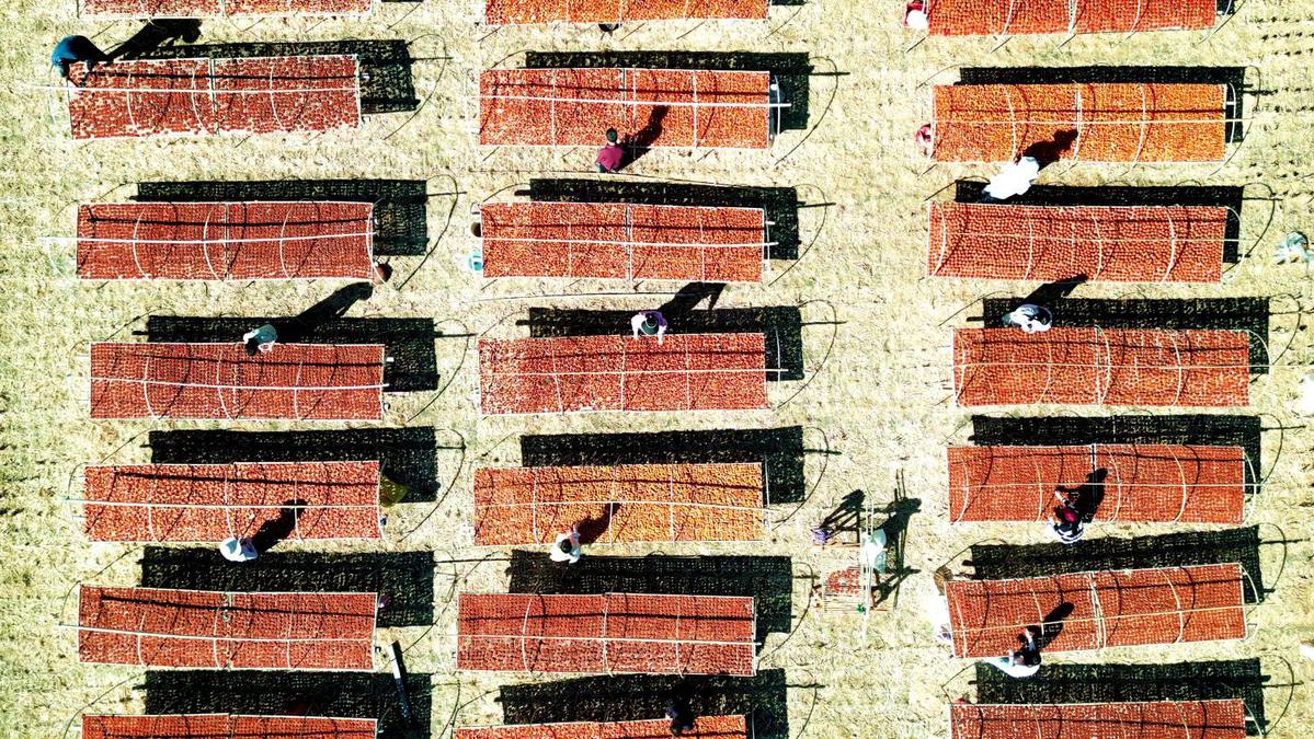 11月10日,永定区陈东乡城东村的柿饼晾晒场一派繁忙。柿农徐满娣正带着村民忙着制作订单柿饼,竹架上金灿灿的柿饼整齐排列,远远望去,仿佛给大地披上了一层“黄金甲”。