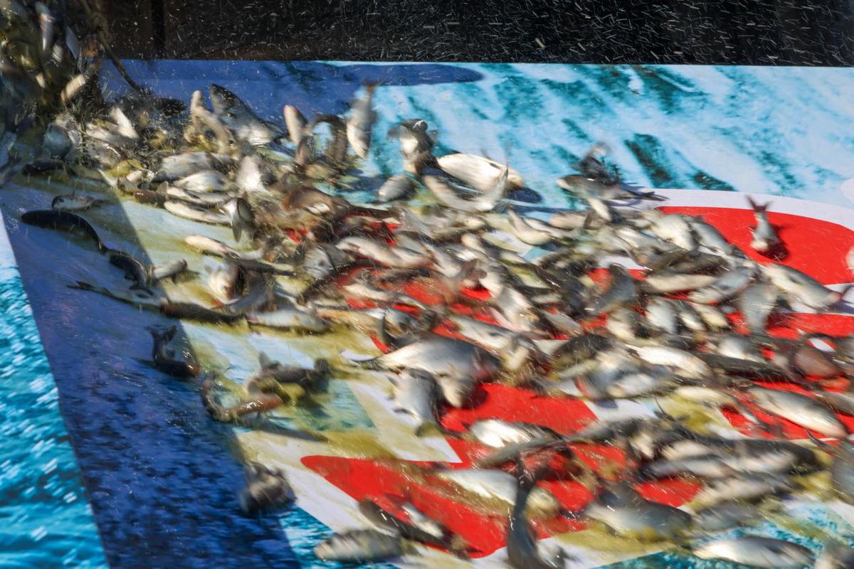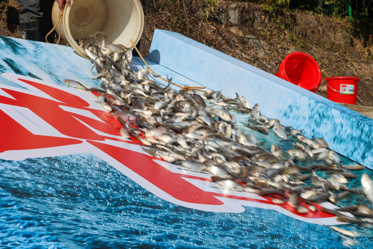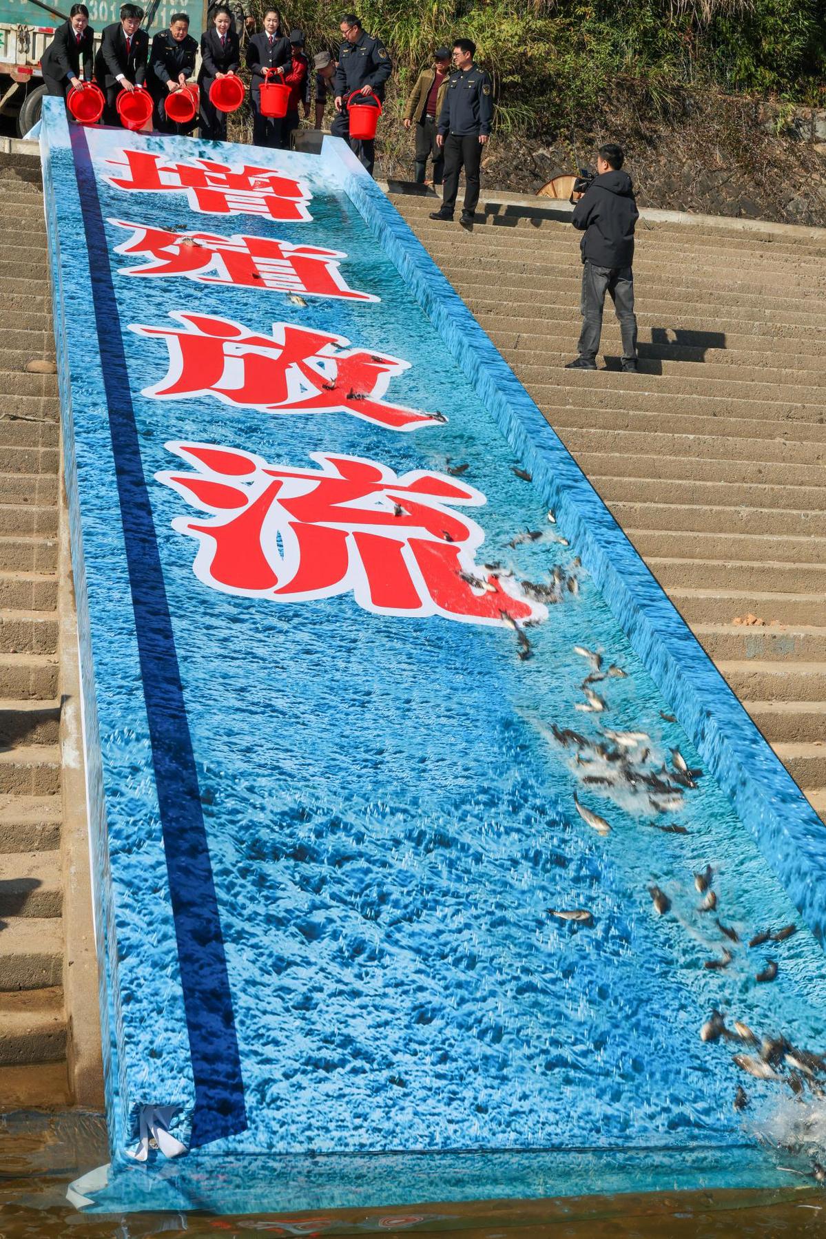 11月21日,武夷山市农业农村局工作人员在闽江上游崇阳溪东溪投放鱼苗。(邱汝泉 摄)