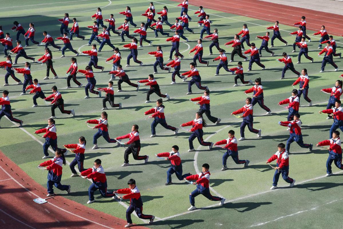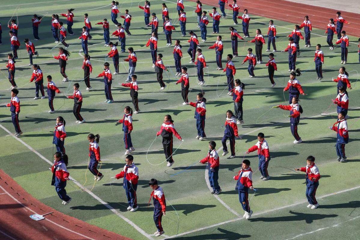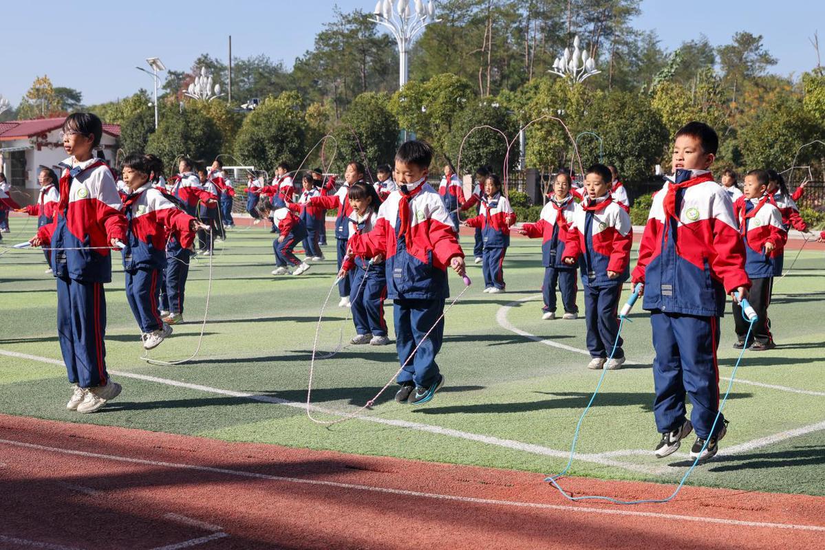 当日,武夷山市新丰小学大课间举行“绳操飞扬绽新颜 赛场逐梦勇扬帆”绳操比赛。学校学生身着统一服装,以整齐规范的动作、展现绳操魅力。学生手中的跳绳翻飞如蝶,与欢快节奏完美契合,动作包含手臂摆动、跳跃、转体、绕环等。武夷山市新丰小学将绳操融入体育课教学、阳光体育活动及家庭体育活动中,构建“课堂+课间+课后”运动空间,既是“阳光体育”理念的践行,又锻炼了学生的身体灵活性与节奏感,彰显五育融合成效。